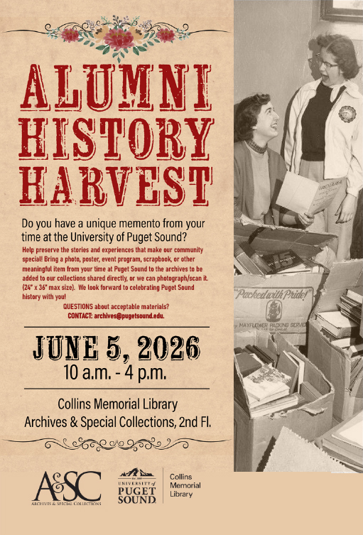 Bring a photo, poster, event program, scrapbook, or other meaningful item from your time at Puget Sound to the archives to be added to our collections (no items larger than a 24 x 36 poster). Materials may be shared directly, or we can scan or photograph your item and include it in a digital collection. If you have questions about acceptable materials, please contact us at archives@pugetsound.edu. We look forward to celebrating Puget Sound history with you!