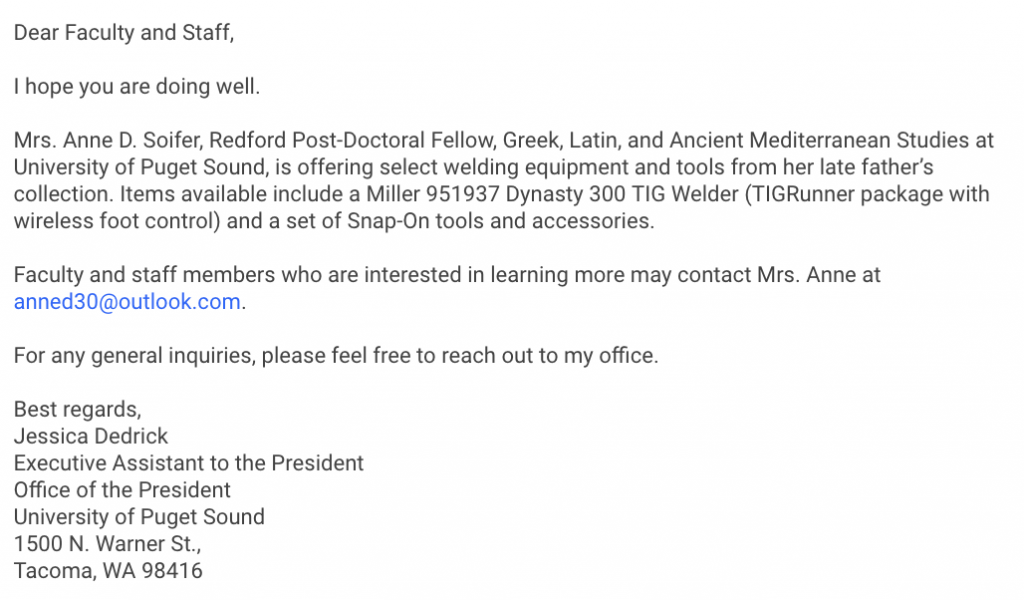 - The sender is attempting to impersonate a staff member at the university by manipulating the display name. However, notice that the email address is not an @pugetsound.edu address.