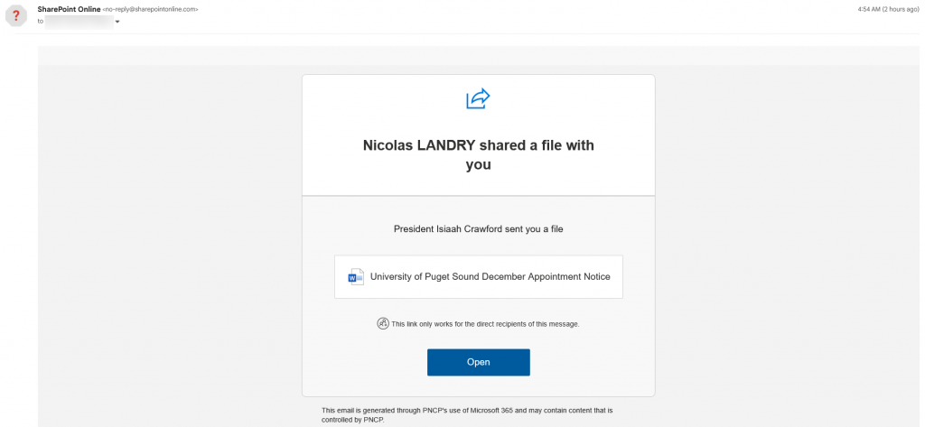 • This email was sent using Microsoft SharePoint. Attackers commonly use legitimate services to share documents that may contain a link to a malicious site or attachment. Always use caution opening secondary links in these shared documents or downloading files.