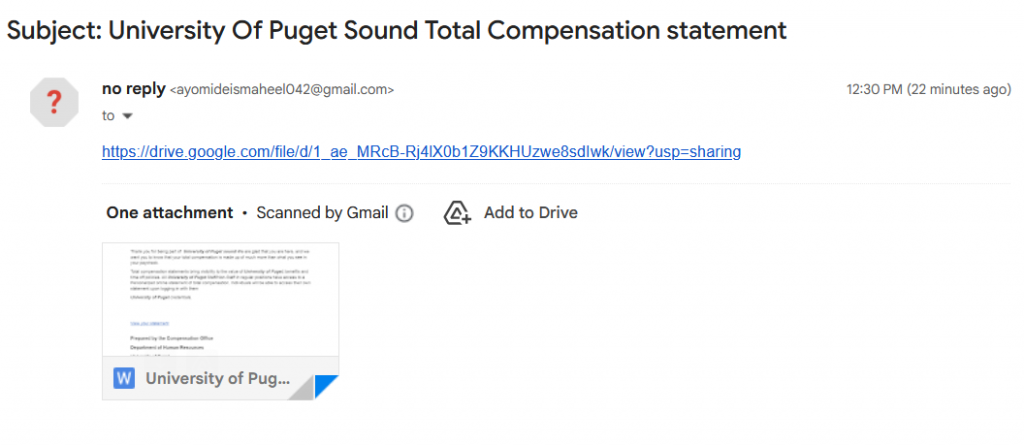 - Notice the email is from an @gmail[.]com address. Legitimate emails from Human Resources will generally come from an @pugetsound.edu address.