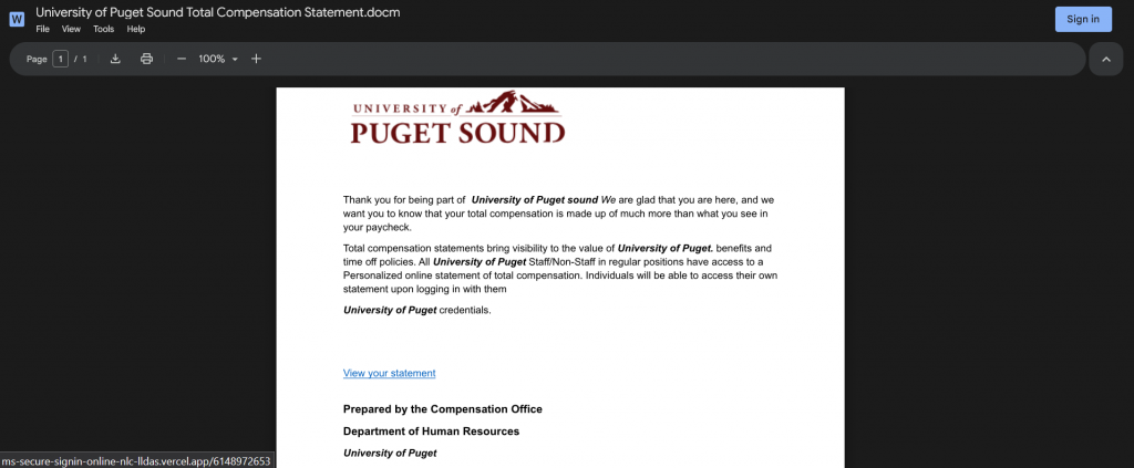 - Notice the link to view the statement goes to a suspicious site (ms-secure-signin-online-nlc-lldas[.]vercel[.]app). Always use caution with links and never enter credentials on web forms or on sites you do not recognize.