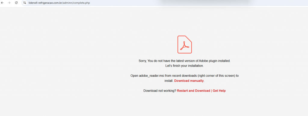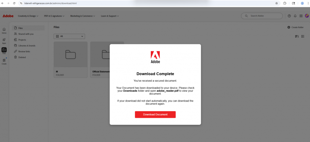 The link leads to liderwll-refrigeracao[.]com[.]br instead of Adobe Document Cloud but attempts to mimic the look and feel of Adobe. This should be suspicious. The page prompts you to download something.