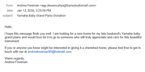 • With this type of phishing, the scammer typically adopts various personas to correspond with you – the purported piano owner and the moving company. What begins as a fairly benign email offering a “free” piano puts you on the financial hook when you are directed to make a payment to cover the cost of the piano delivery. Usually, they will ask for payment via Venmo or Zelle or Paypal or CashApp.