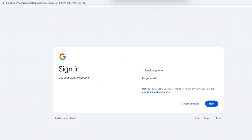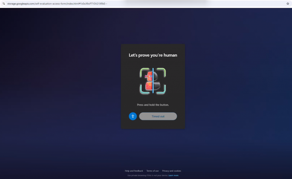 The link neighborhoodshopauction[.]com/self-evaluation-form led to content hosted on storage[.]googleapis[.]com. After passing a CAPTCHA-type prompt, you would be taken to a fake Google sign-in page. Always double-check the URL before entering your credentials on a website to ensure it is a trusted site you normally use for the service (e.g. accounts.google.com). If you do not recognize the website or it looks suspicious, do not enter your credentials.